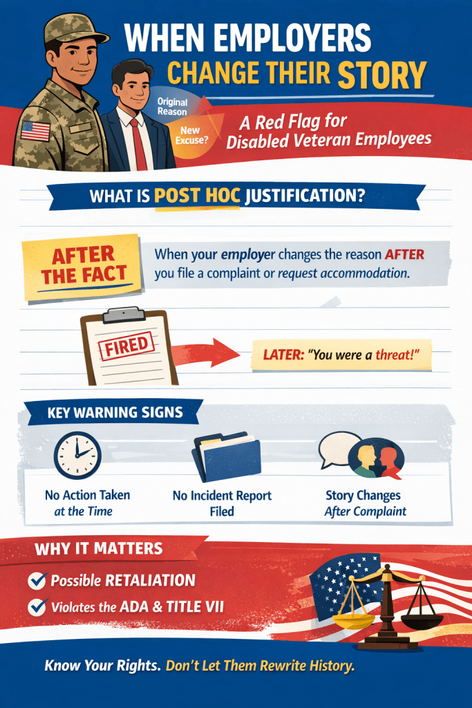 One of the most common tactics employers use to justify unlawful conduct is something called a post hoc justification. Let’s break that down in clear, everyday language and explore how it affects disabled, veteran, or otherwise protected employees.